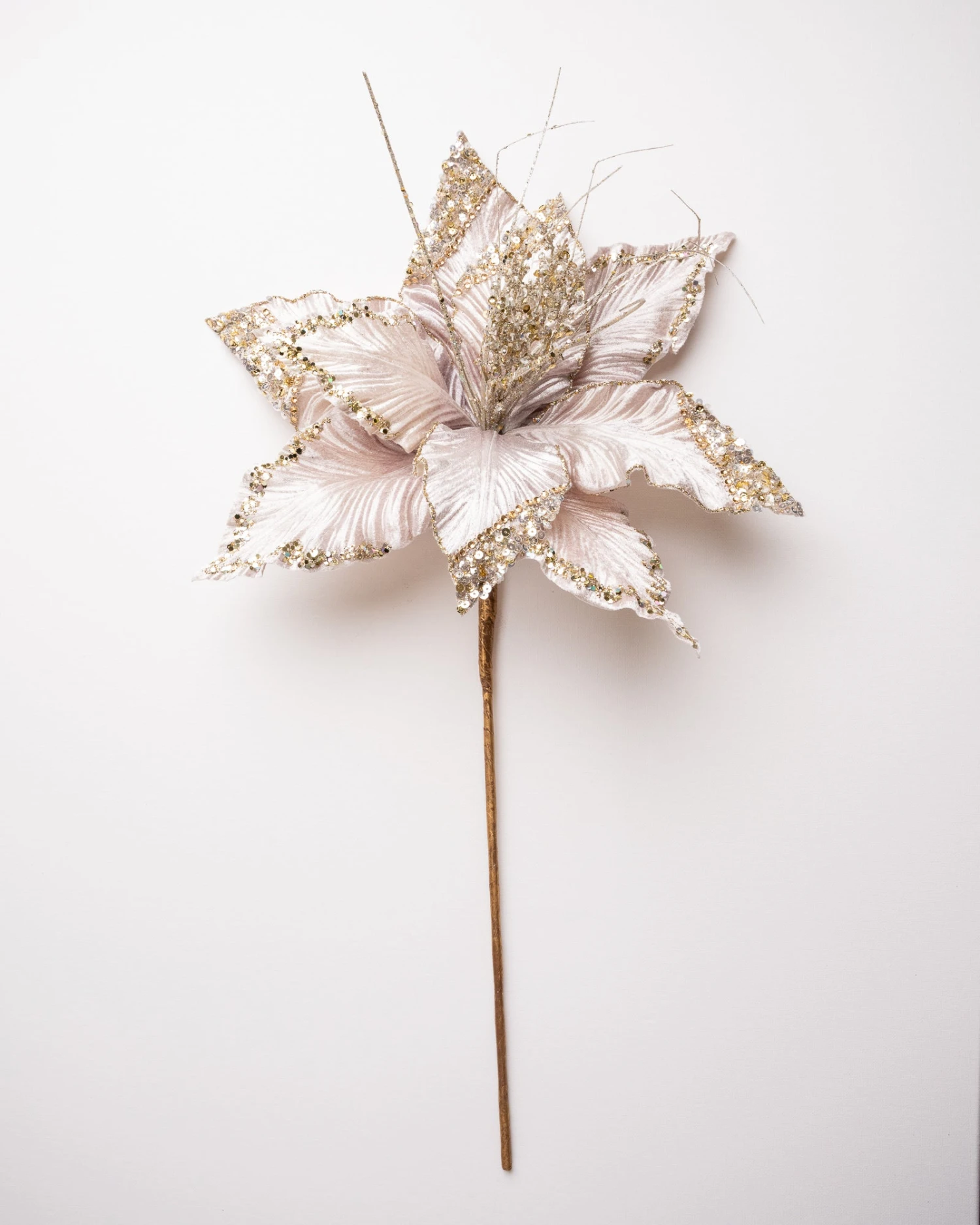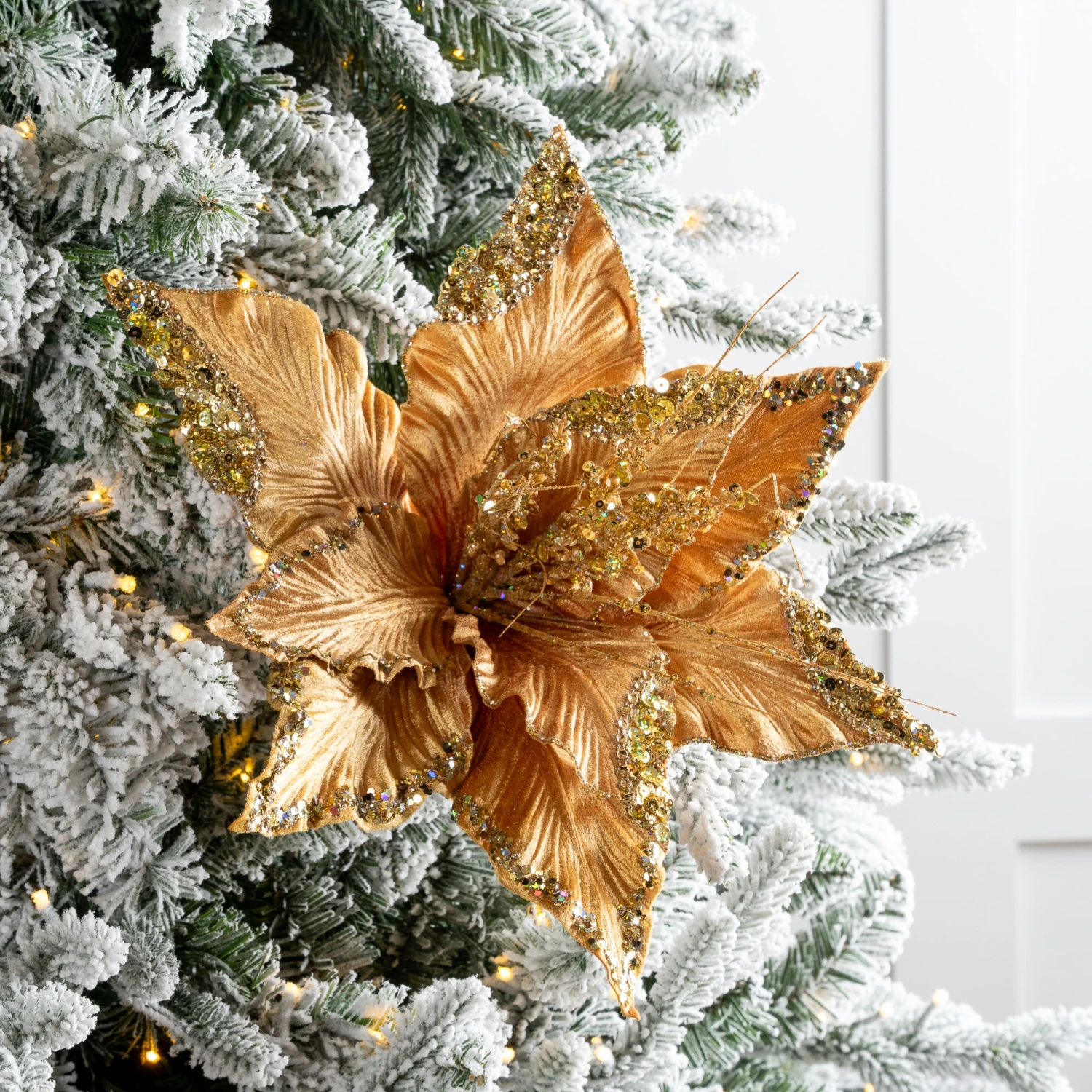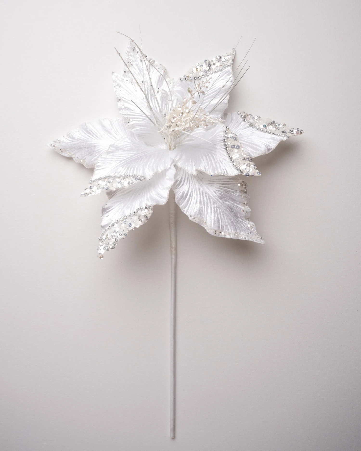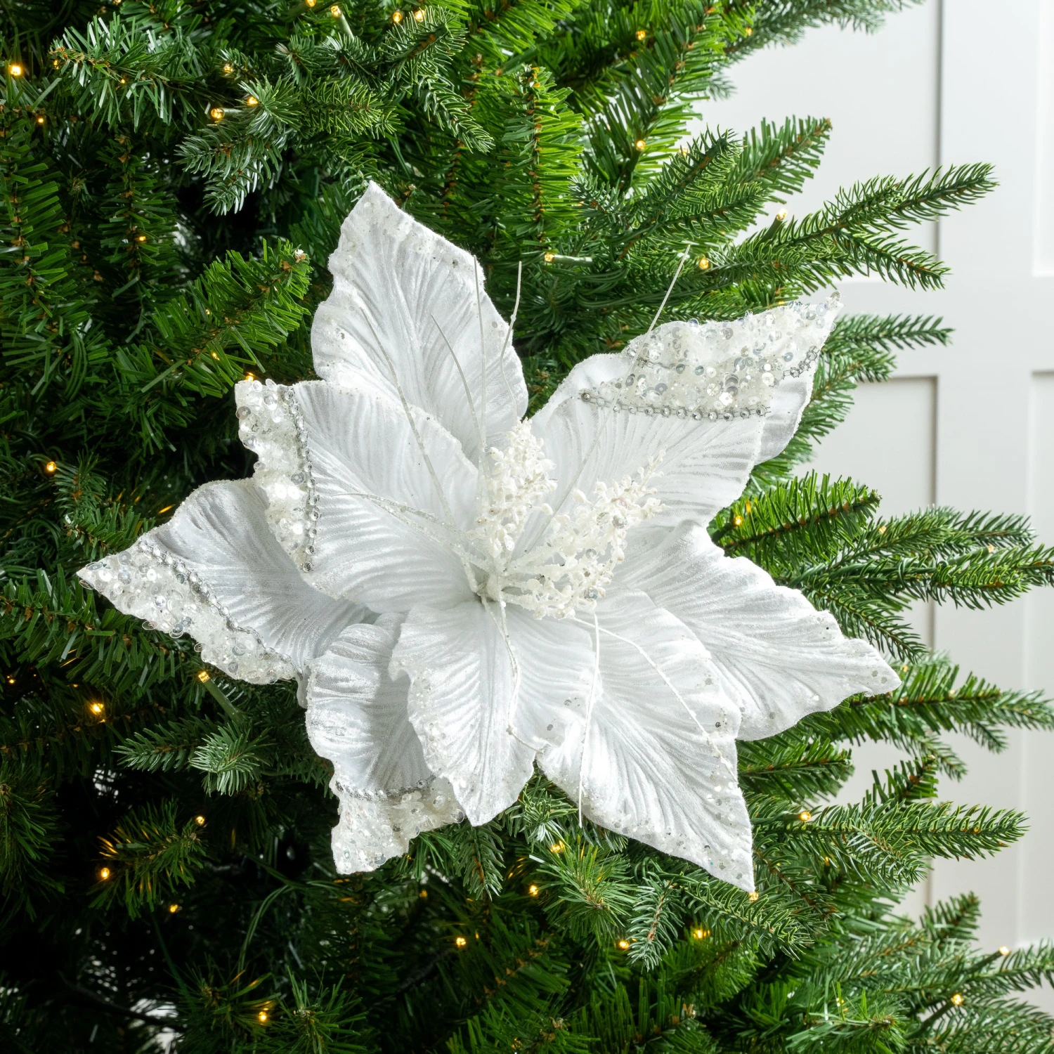 Our fascinating green & silver poinsettia provides incredible contrasting tones that blend through your seasonal decor. The bright petals reflect different shades of green with their glittery icy coating and glistening jewels. With a flower head almost as big as it is long – this breath-taking flower is featured is perfect for a modern day look and can fill your trees and wreaths with its magical beauty.