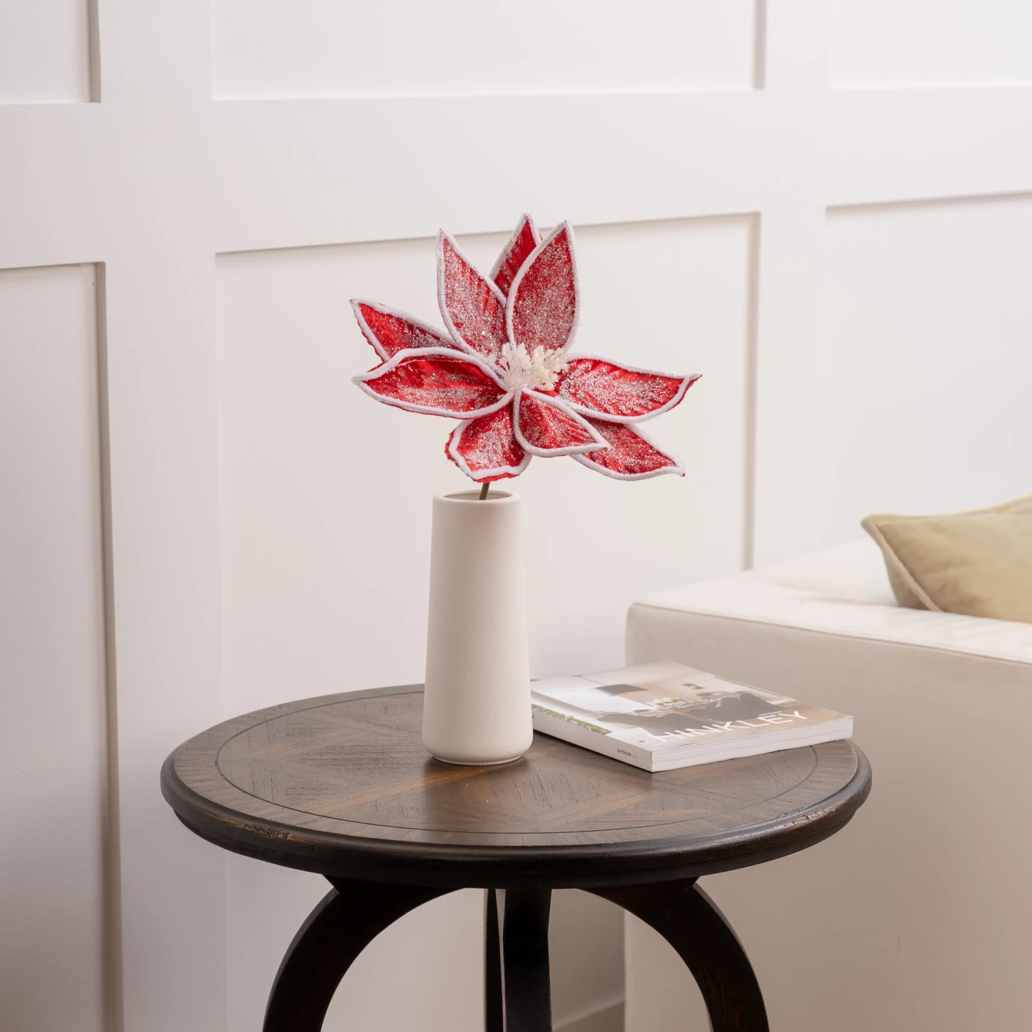 Elevate your Christmas decor with this beautiful frosted cotton candy colored poinsettia. Beautiful soft pink that has a lovely white chenille trim around each petal & is topped off by crystal like stamen in the center.