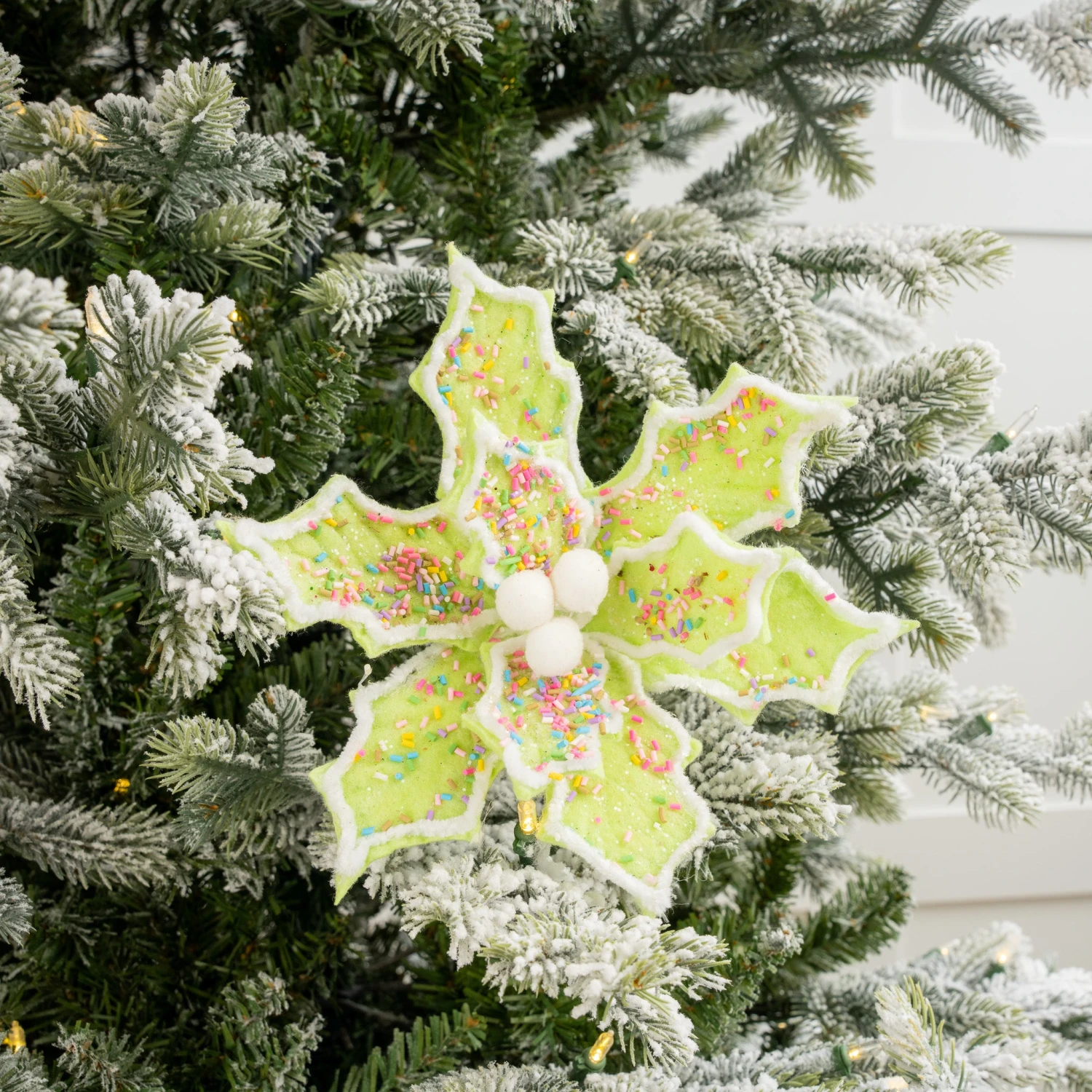 Accent your whimsical or candy themed trees with this eye-catching candy sprinkle themed green poinsettia. This poinsettia would complement any of your candy themed, gingerbread themed, or colorful design ideas.