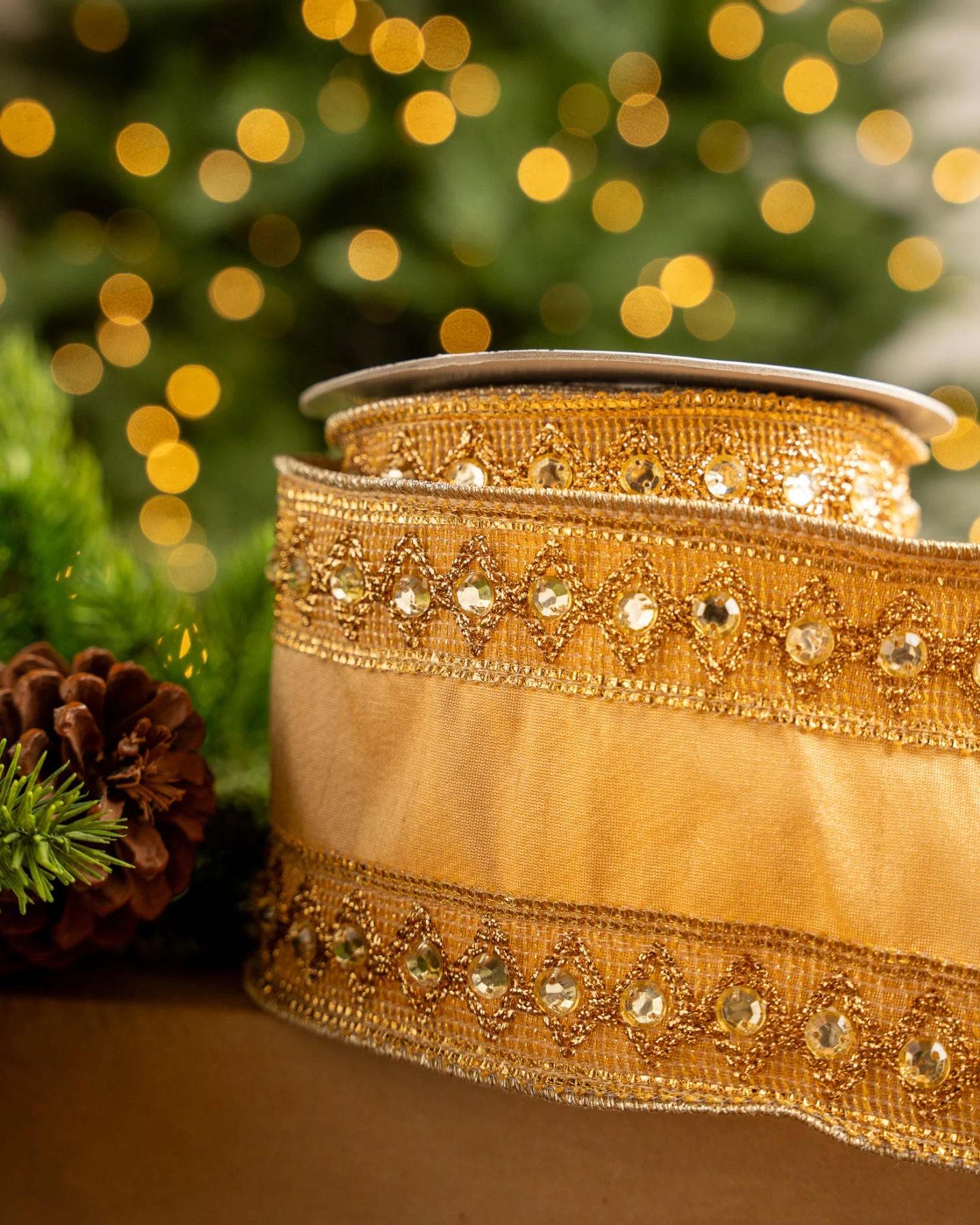 SKU: DGHLY 1695826874 Categories: Ribbons & Bows, Tree Decorations Tags: Collection:The Christmas Palace Collection, Color:Gold, Size:5 Yard, Style:Ribbon, Width:4"