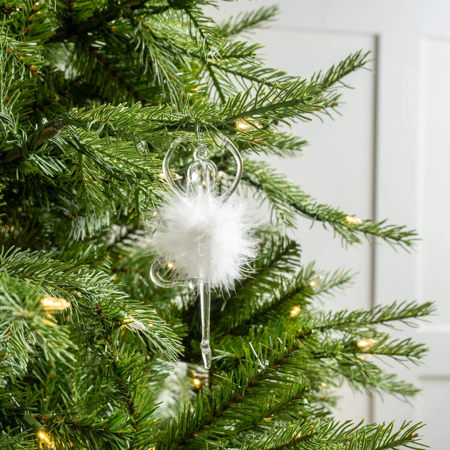 Bring charm to your holiday decor with this set of 6 glass ballerina ornaments. Each clear glass figure is adorned with a white feathered tutu, creating an enchanting and whimsical look. Add a bit of grace and beauty to your festivities!
