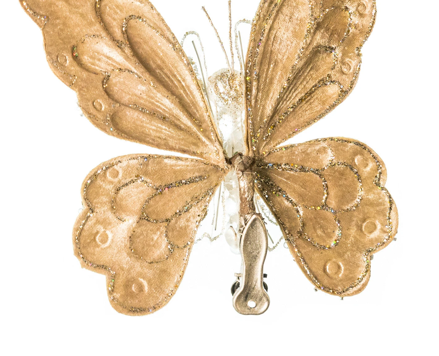 Add this stunning butterfly clip featuring champagne glitter and clear gems, this simple but elegant butterfly ornament is sure to add a stylish touch to your holiday tree.
