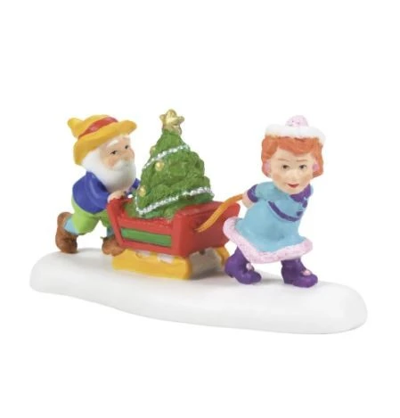 This elf couple is very happy with their selection of a pre-decorated tree for their tiny elfin home.. They use a sled to carefully transport this beauty “home sweet home.”